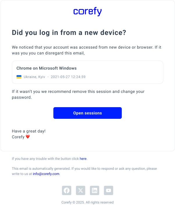 When the system registers a new user session, it sends you an email with an alert that a New session is detected. When you receive such a message, ensure to examine the included information thoroughly.