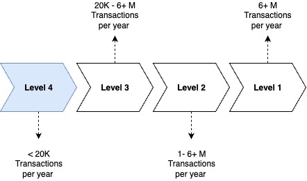 PCI DSS Level 4 pertains to Merchants that process less than 20,000 Visa or MasterCard eCommerce transactions annually or those that process up to one million Visa or MasterCard transactions annually.