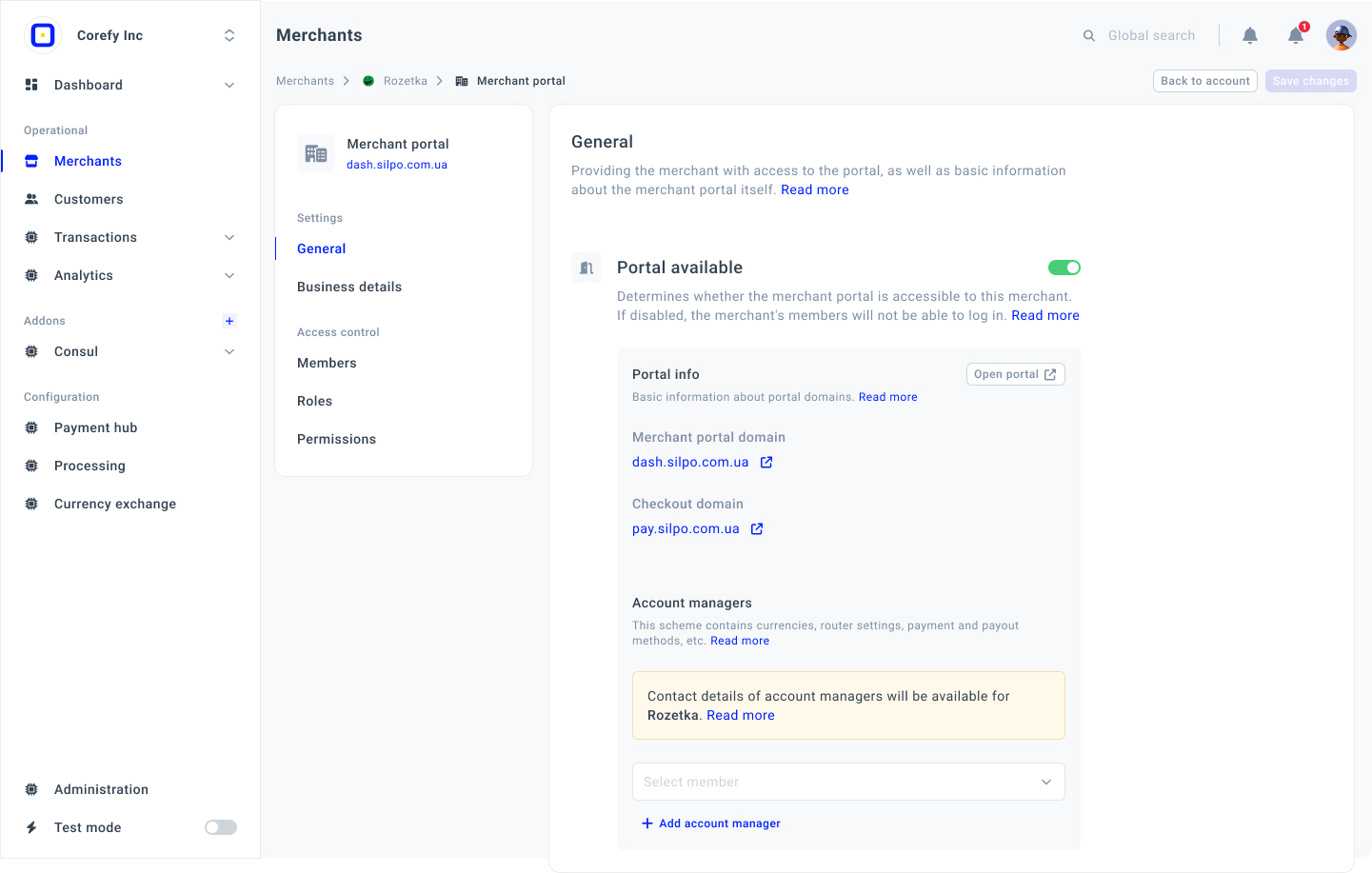 - To enable access for a given Merchant to the Merchant portal, switch on the Portal available toggle.