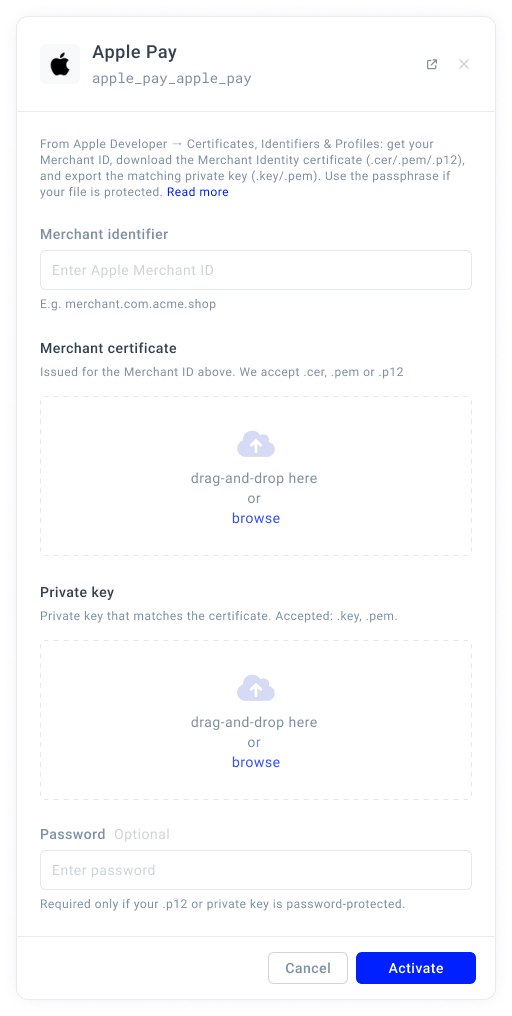 - After adding the Method to the grid, click Apple Pay > More options > Activate.
