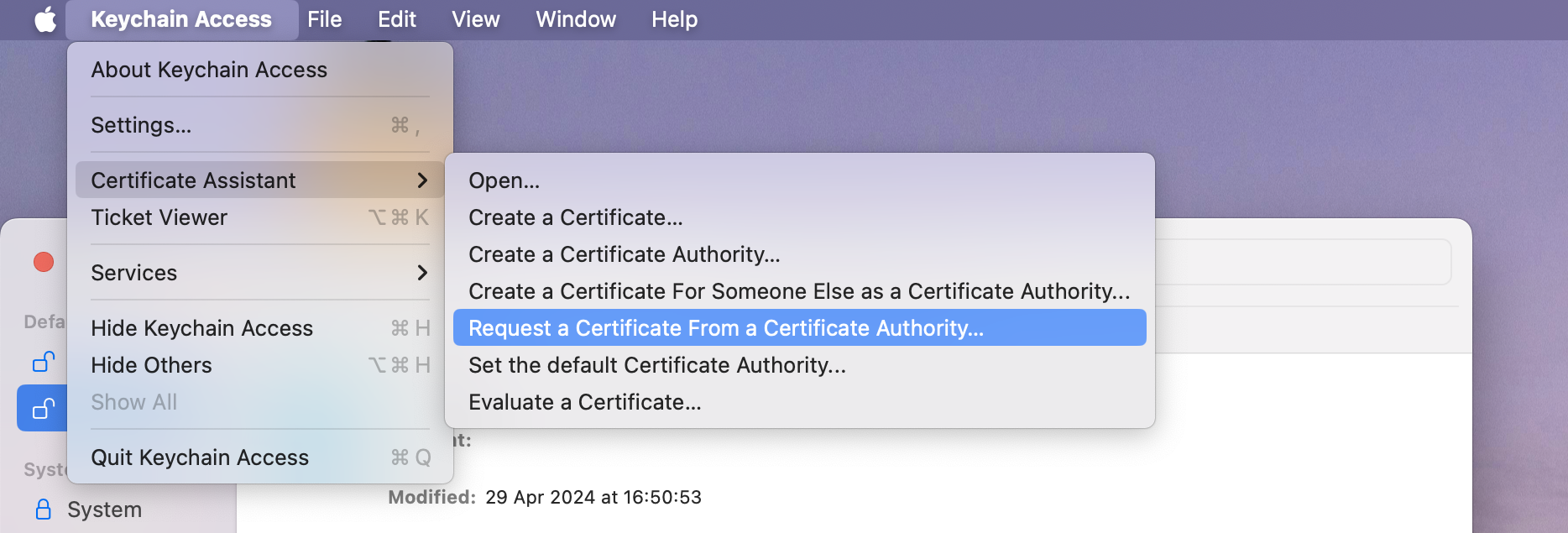- In the Keychain Access, go to the Certificate Assistant. Then, click Request a Certificate From a Certificate Authority.