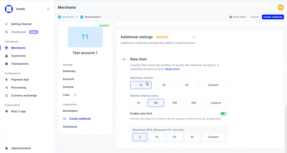 - You can also establish the Rate limits to determine the Maximum Webhook requests per second (PRS).