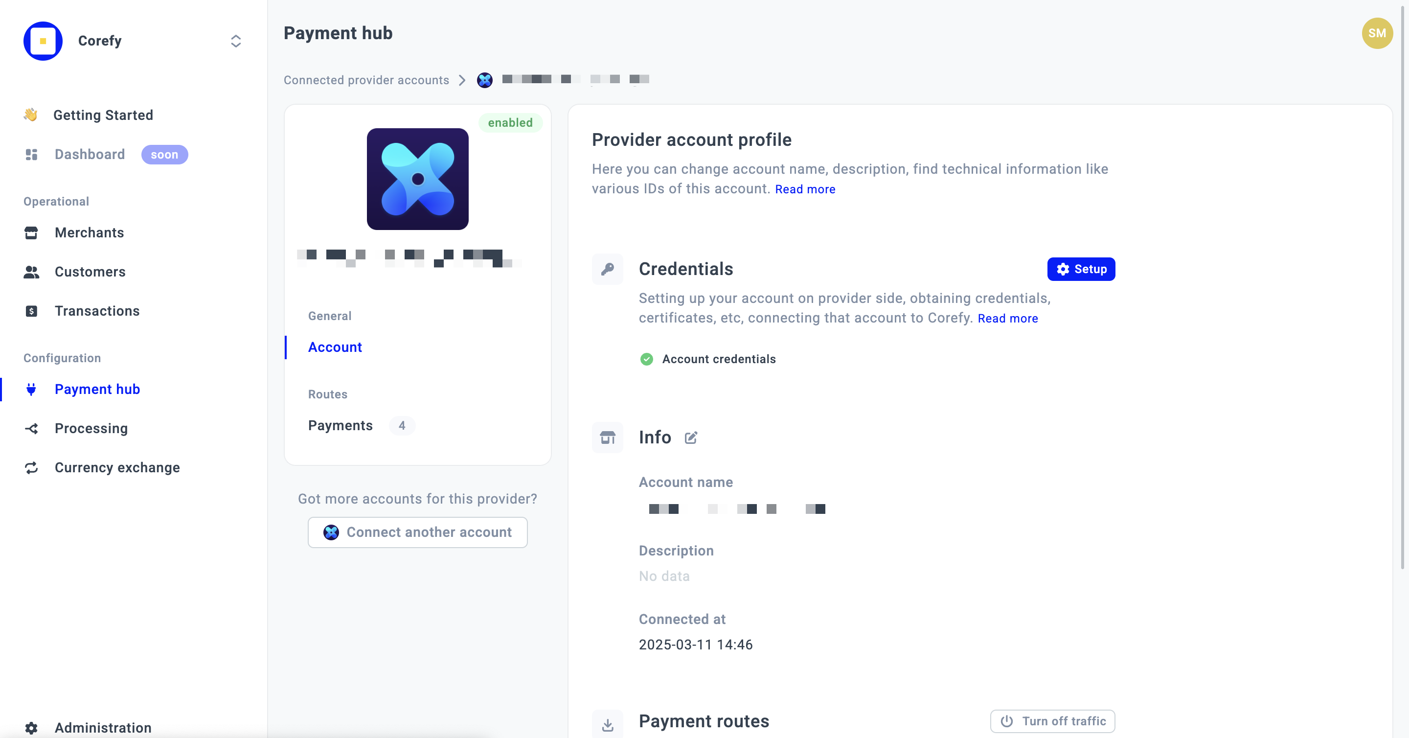 - Then, click Setup. If the credentials are linked correctly, the specific Provider fields are not modifiable and are marked as blocked.