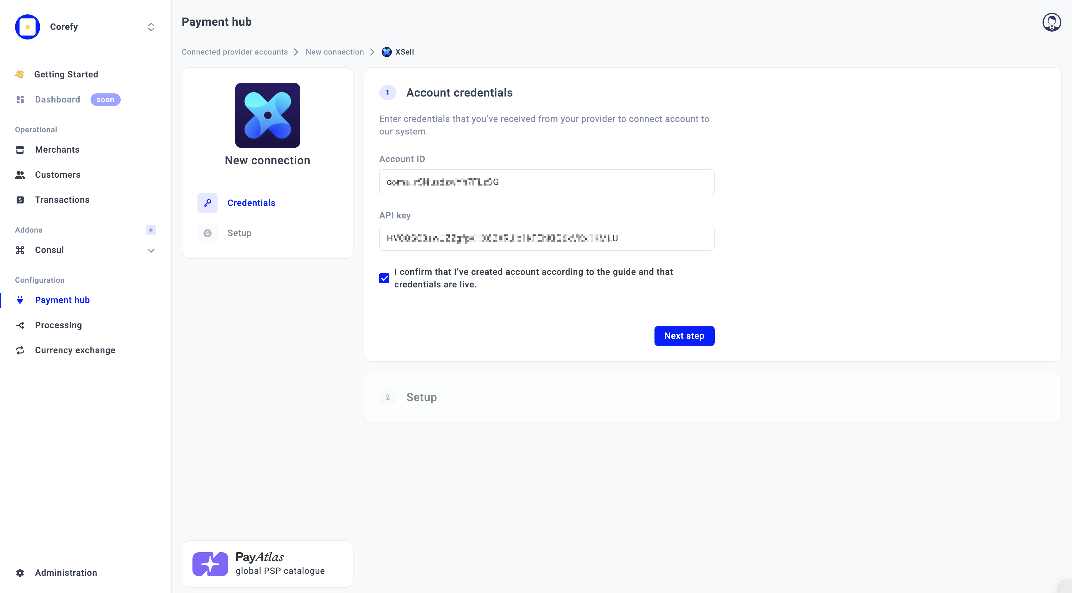 - Click I confirm that I’ve created account according to the guide and that credentials are live and move to the Next step.