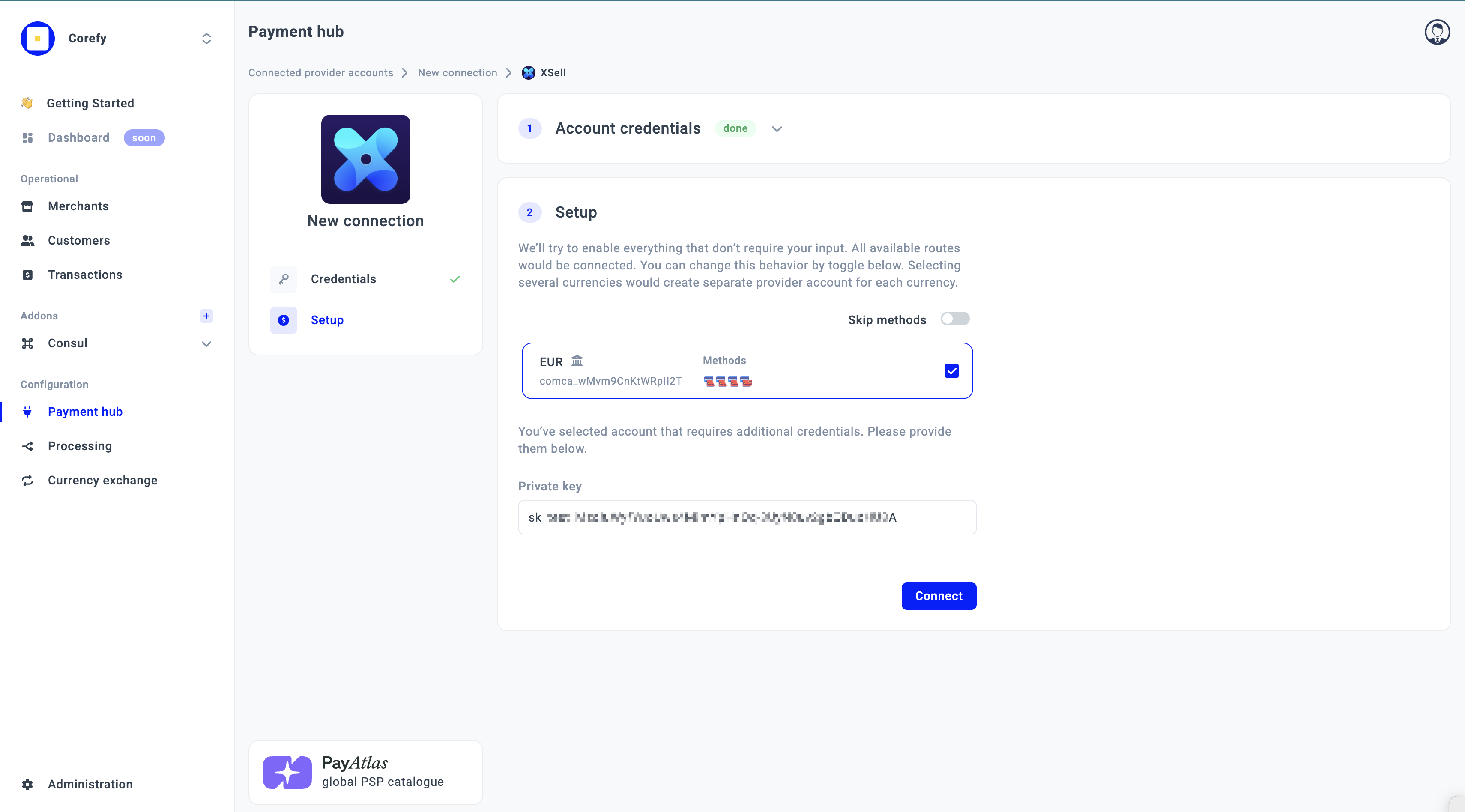 - To connect XSell, navigate to a Payment Hub and click New connection.